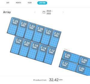 (As of June 2022, electricity from the grid costs around $.26/kwh; the array conservatively produces 5 MWH each year. The pic is from the monitoring software, which I rarely check.)
